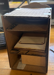 I made only a small change because I thought it looked rather empty. I also rounded the corners of the shelfs to not make it seem too boxy. While making the files I added an engraving on the back where that smoothed part is. I thought it would add a nice touch and not make it seem like a simple box. I was able to cut out a test in cardboard and the distance between each shelf was perfect because all the items I plan on storing aren't actually big and are almost like travel sized products.