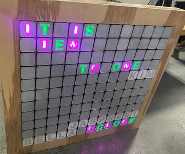 I'm very glad that the clock worked in the end and the lights look amazing. We might connect more power into the board because the lights do flicker when more lights are being used. This would require another line of power to connect to the PCB which we do have on the board but not a line. I also wanted to change the delay because the display doesn't change unless if the minutes are an even value.